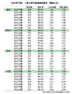 首都圏の競売物件数は、長年にわたり減少傾向が続いてきましたが、2025年は増加に転じました。一方、落札率は低下傾向にあり、およそ3年間減少が続いていた入札本数は、2025年下期に入り横ばいからやや増加しています。また、落札価格は下落傾向が続いていましたが、2025年下期は上期と比べてやや上昇しました。